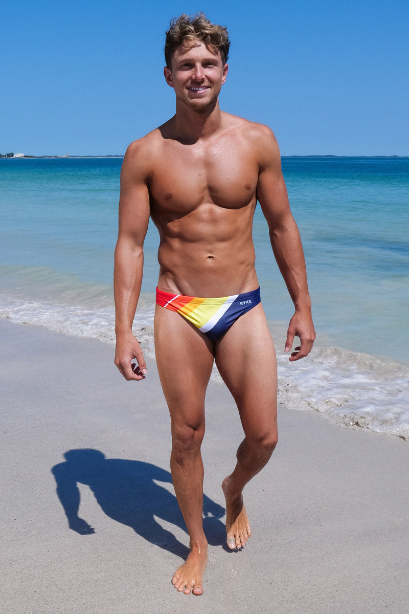 Multi coloured swim brief. Made from Recycled Polyester/Spandex fabric. Available in both the Classic and Racer Cut . The Mason has a front lining and white draw cord.
