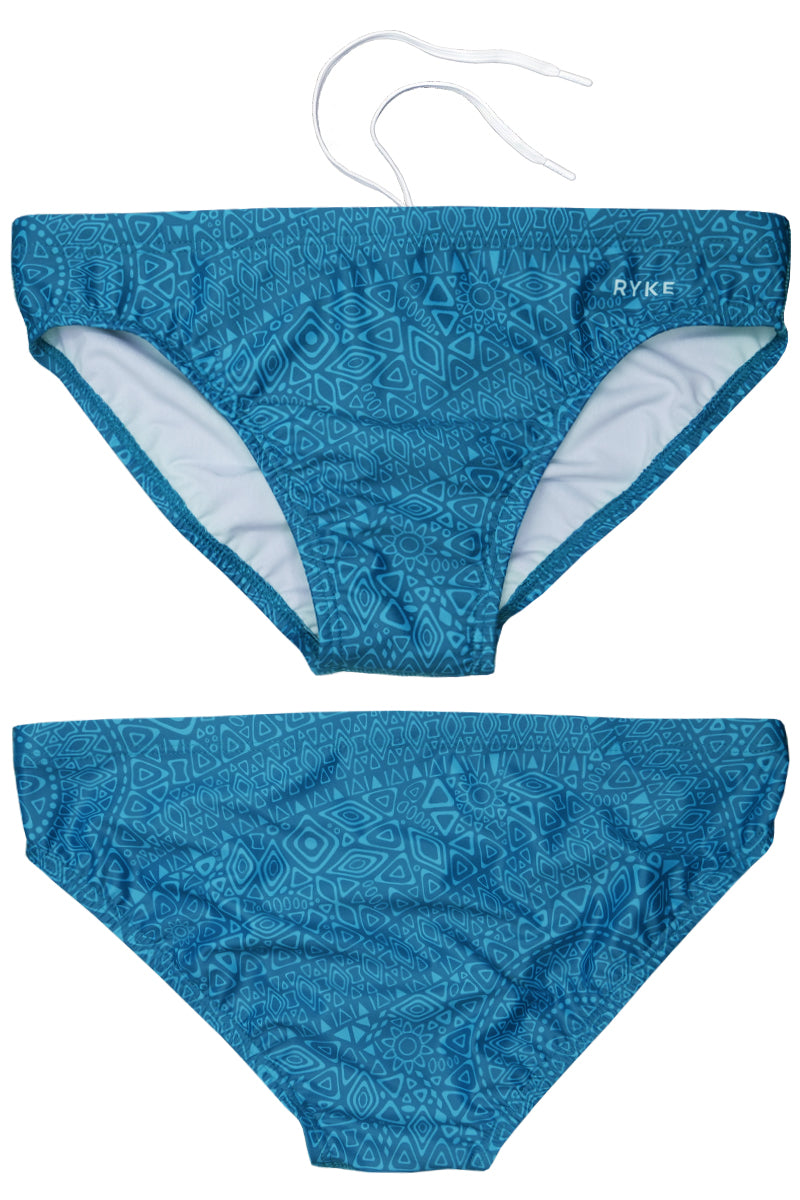 Aqua and ocean blue swim brief. Made from Recycled Polyester/Spandex fabric. Available in both the Classic and Racer Cut . The Orion has a full front lining and white draw cord.